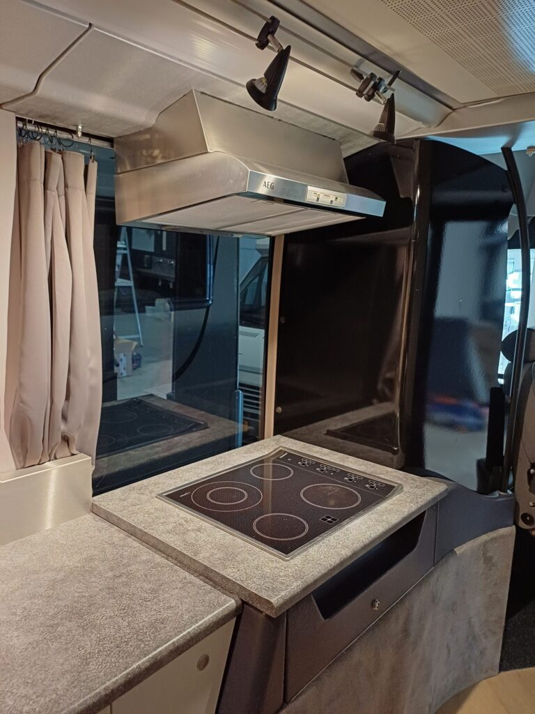 Daarnaast is de camper “gasloos”, je kookt elektrisch op een keramische kookplaat.