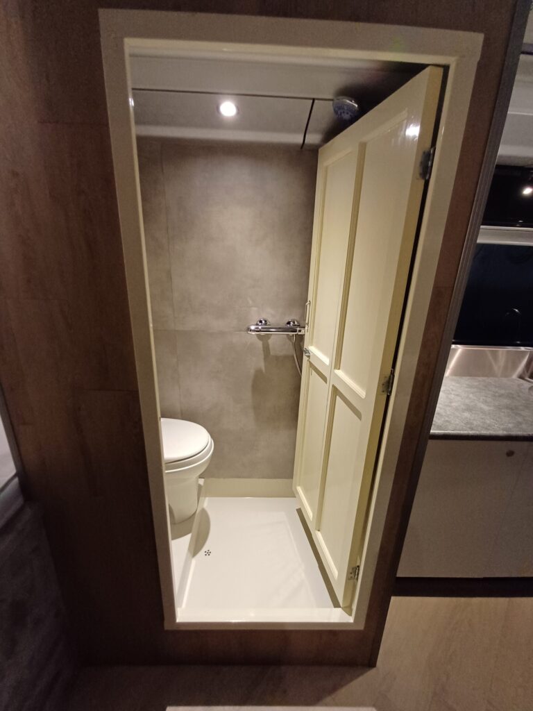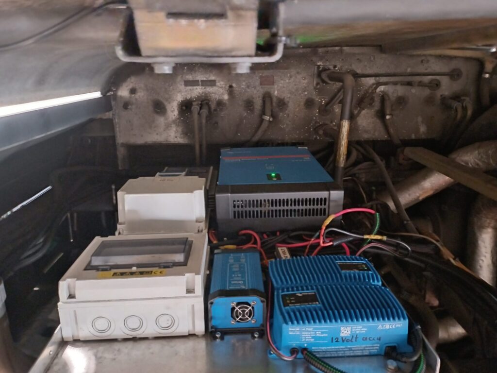 Er zit een Eberspächer diesel heater in voor het verwarmen en een elektrische boiler van 10L voor het warm water.