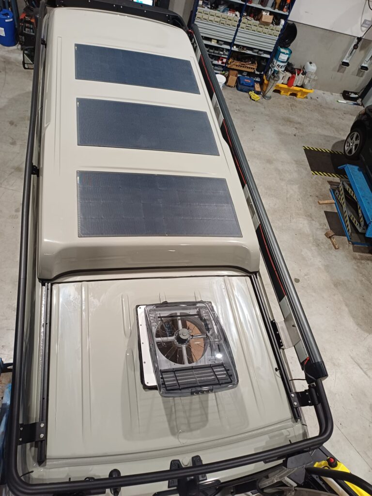 Platte zonnepanelen op 4×4 camper plaatsen Op het dak van deze mooie 4×4 camper hebben wij ultra platte zonnepanelen geplaatst.